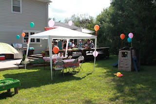 To make the backyard even more festive and tie in all the nautical colors we got a dozen latex balloons in coral pinks and orange and sea green.