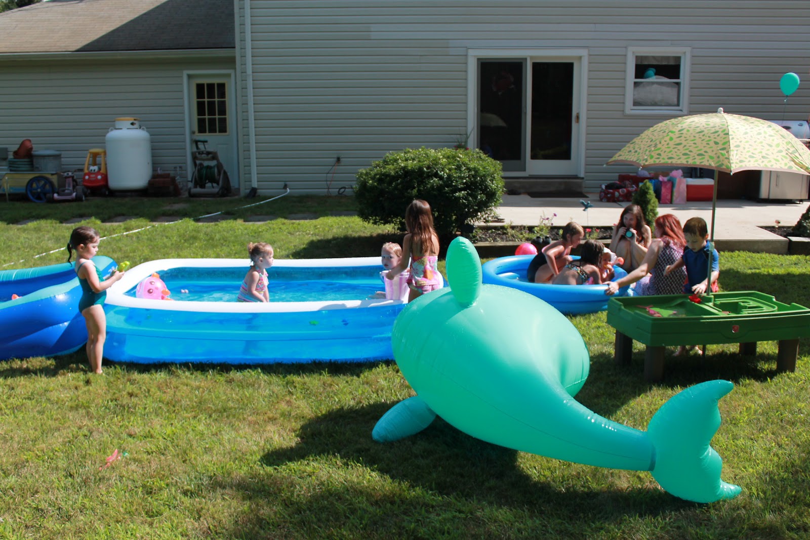 Summer backyard water toys are a natural fit for the sea creature party theme. We set up several different kiddie pools (2 bigger ones and 1 smaller one for the baby). We also had a slip-n-slide and water table set-up so the kids had lots of outdoor water fun options to keep them busy.
