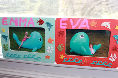 We made sure to get a picture of each kid on the whale and then printed them out on a 4×6 photo printer (again, my niece was SUPER helpful). Before the party we painted cheap wooden frames we got from the craft store for only $1 each. We painted them a light ocean blue color and personalized them with names of each of the kids at the party.